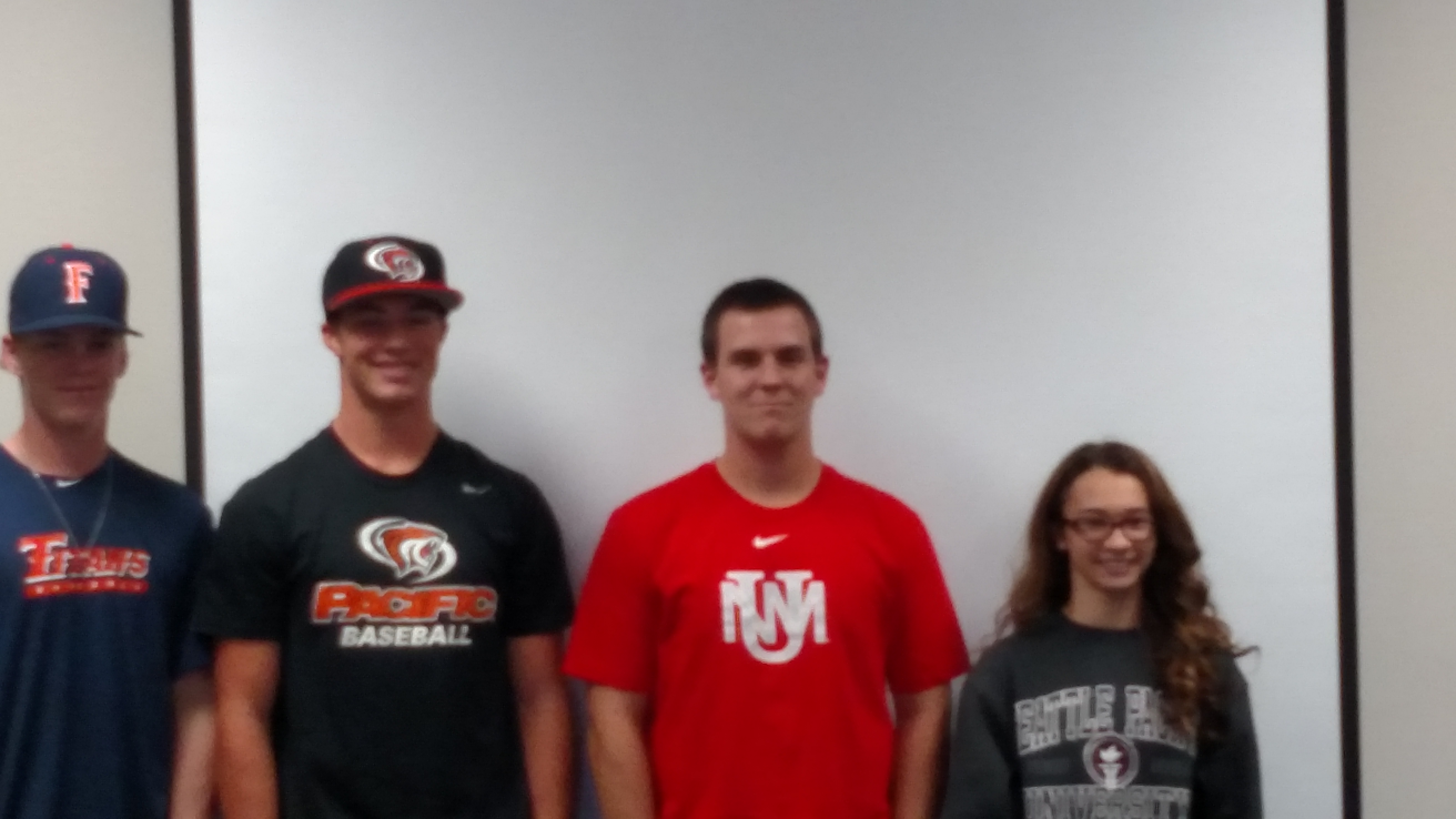 The scholarship signing Nov. 12 for Glendora students included gymnast Isabella Tsark (Seattle Pacific University), and baseball players Ryan Beyer (University of the Pacific), Austin Isenhart (University of New Mexico) and Nick Kaye (Cal State Fullerton).