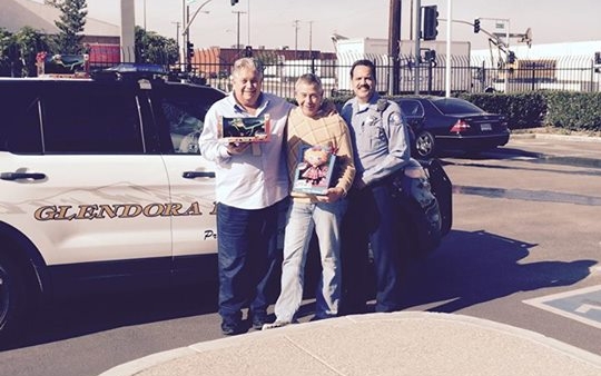 - The Versluis family receives Christmas donations from Glendora Police Chief Tim Staab and motor officer Bill Turnley.