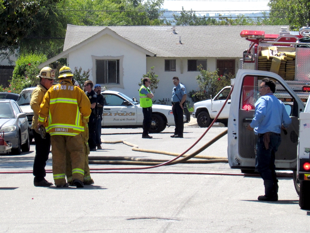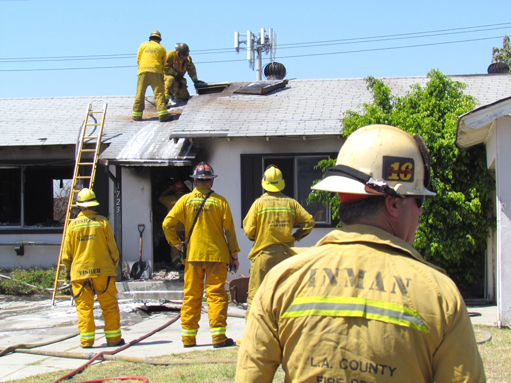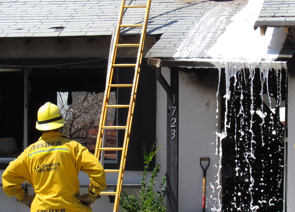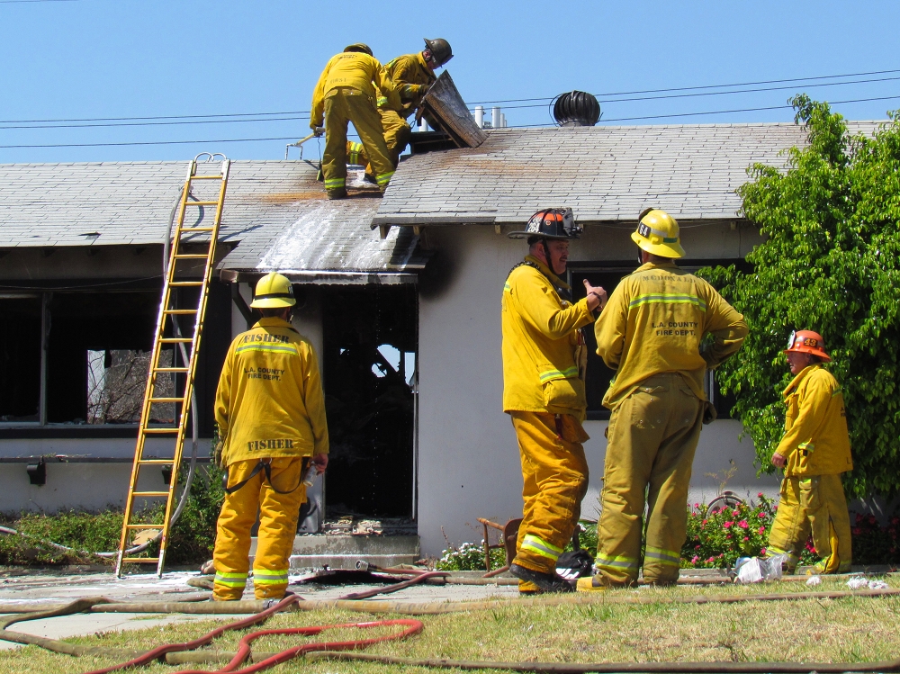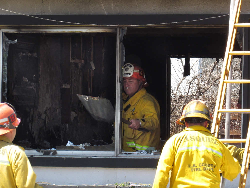 - A Los Angeles County Fire Fighter works on overhauling the interior of a home after a fire ripped through the property Saturday, April 11. Photo by Aaron Castrejon