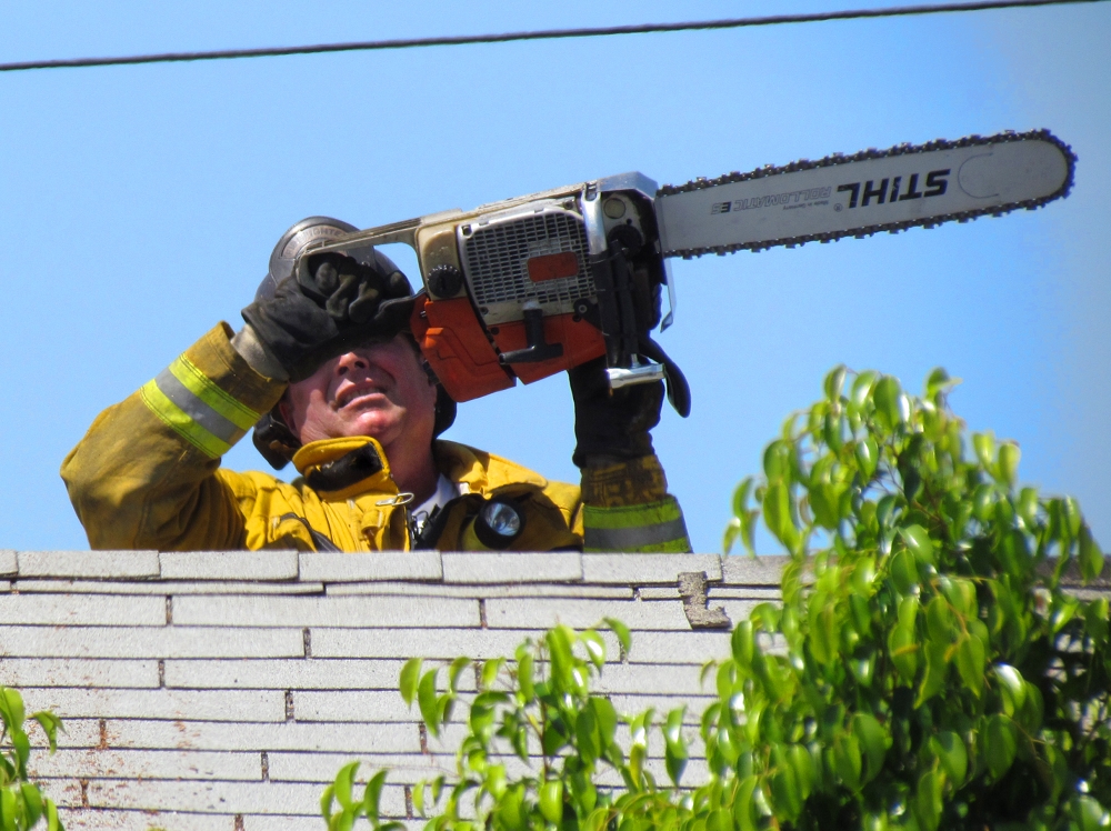 - A Los Angeles County Fire Fighter works a chainsaw to cut ventilation holes in the roof of a home gutted in a house fire on South Bender Avenue. Photo by Aaron Castrejon