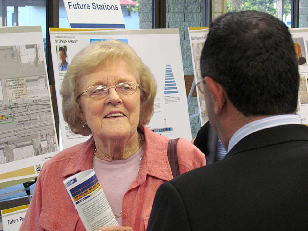 - Lisa Levy Buch, director of public affairs for the Foothill Gold Line Construction Authority speaks with curious residents at the Open House Thursday, April 23. Photo by Aaron Castrejon.