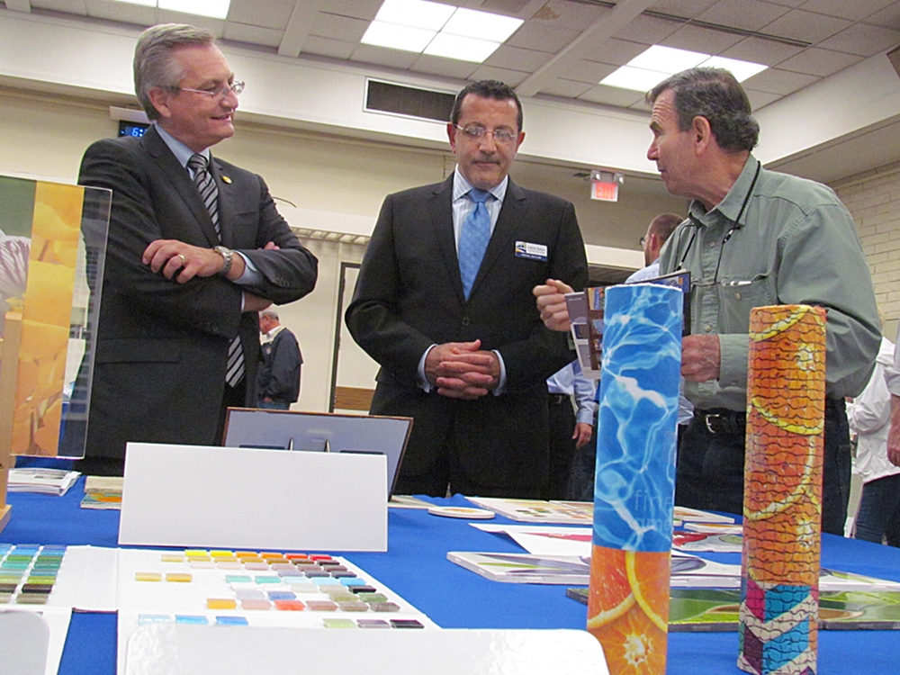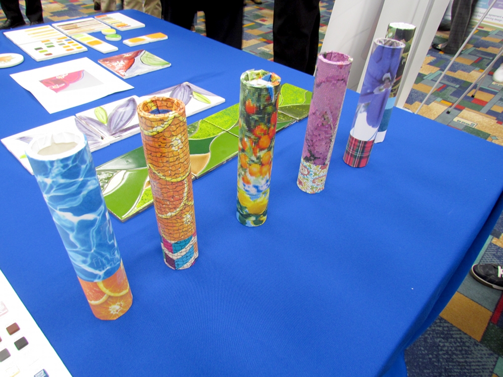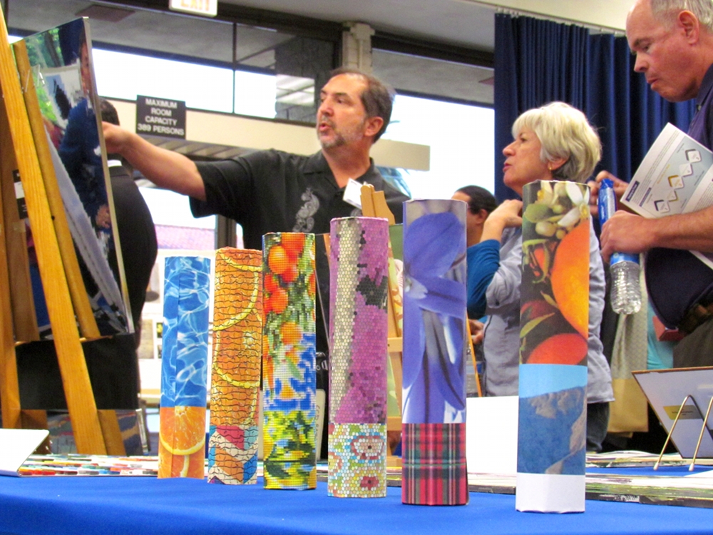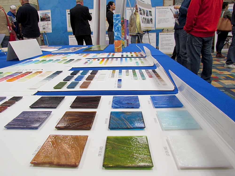 - Some examples of the pillars to decorate the Gold Line’s Glendora Station were also on display. Columns will be decorated with multitudes of glass tesserare tiles. Photo by Aaron Castrejon.