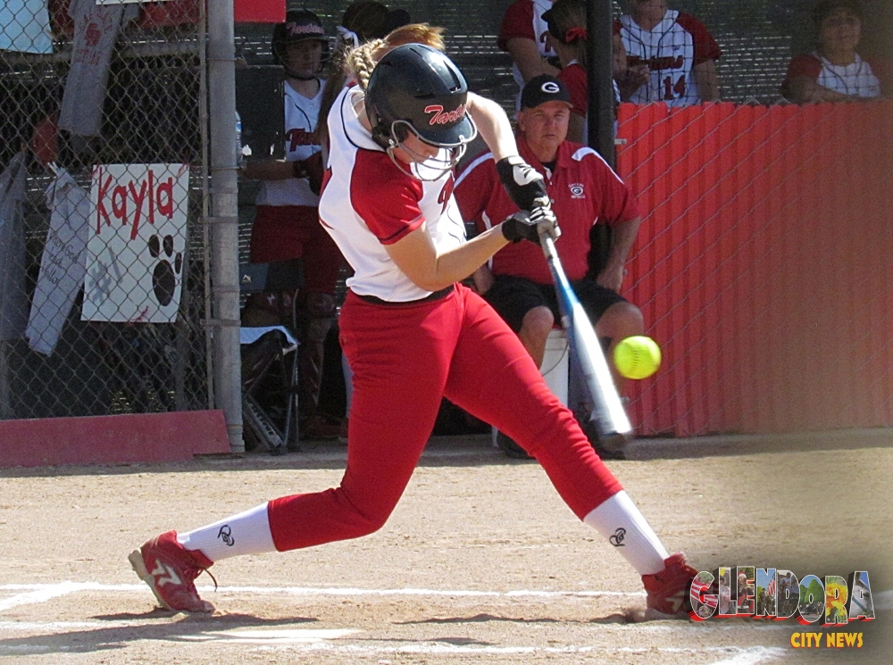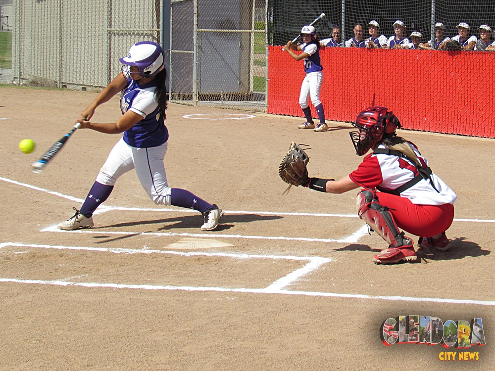 - Glendora infielder Randi Farricker makes a solid hit to bring in base runner Kayla Sok. Photo by Aaron Castrejon.