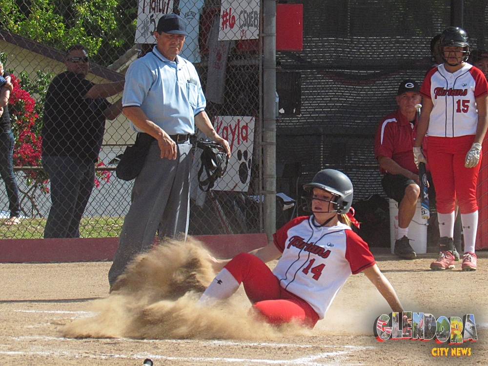 - Taylor Tetone slides across the plate to bring in one of the three runs scored during Glendora softball’s explosive 3rd inning May 12. Glendora won the game 5-1. Photo by Aaron Castrejon.