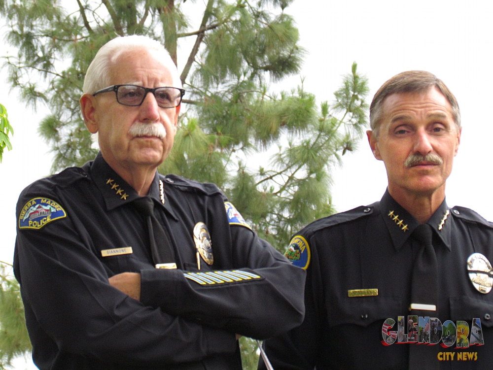 - Sierra Madre Police Chief Larry Giannone and Pomona Police Chief Paul Capraro arrive to Via Verde Park June 9 to honor Louie Pompei. Photo by Aaron Castrejon.