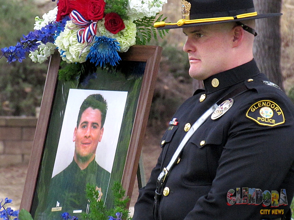 - Glendora Officer Ray Kodadek, a member of the department’s Honor Guard, stands near a portrait of slain Glendora Detective Louie Pompei. Photo by Aaron Castrejon.