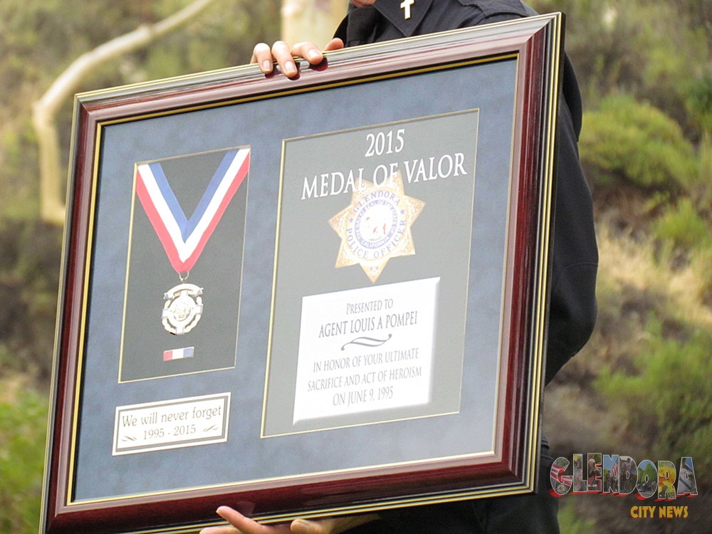 - The Glendora Police 2015 Medal of Valor was posthumously given to Detective Louie Pompei June 9 at Via Verde Park in San Dimas for thwarting the robbery of a Vons Market nearby. Photo by Aaron Castrejon.