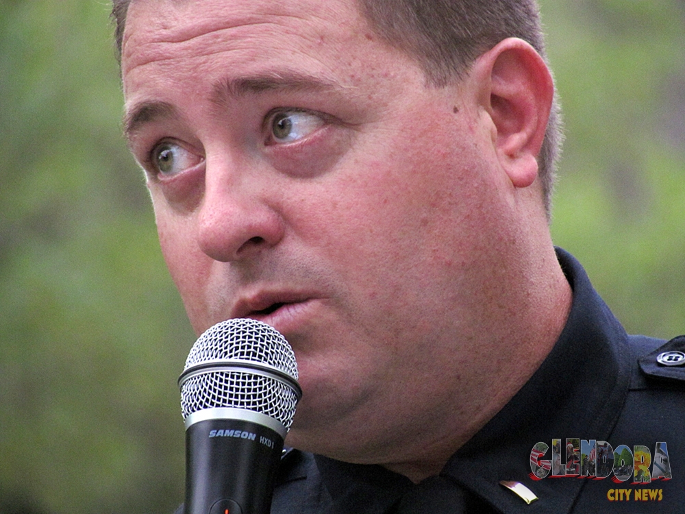 - Glendora Lt. Matt Egan recites “The Monument” in honor of fallen Glendora Police Detective Louie Pompei. Photo by Aaron Castrejon.